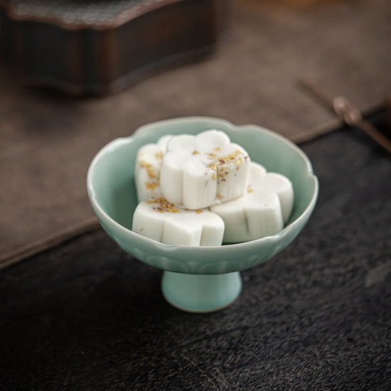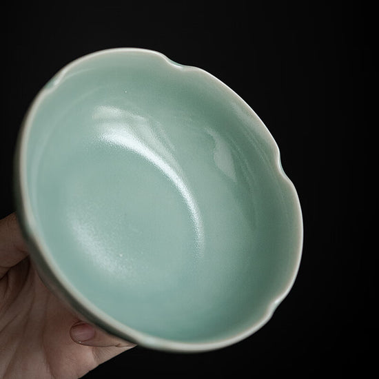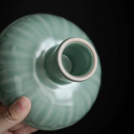 外壁に蓮の花弁の浮彫り模様、全体を古代の豆青釉の色で仕上げ、宋式の雅な生活を感じる。