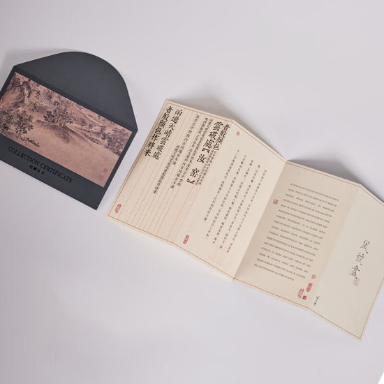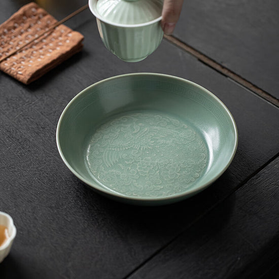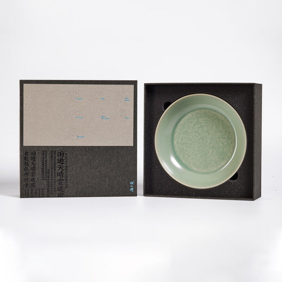 遼代双鳳紋金銀盤 を設計のインスピレーションとして、伝統的な汝窯磁器技術を表現して、72の製作工程を経て、1350の高温で焼成した。
